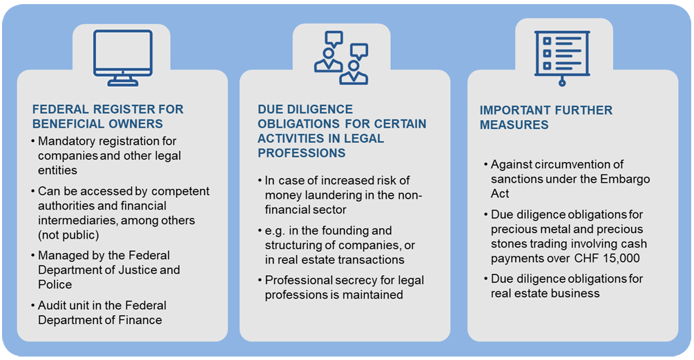 Federal Transparency register: A non-public register will be introduced, mandating Swiss legal entities to list their beneficial owners. The Federal Department of Justice and Police will manage this register, leveraging existing infrastructure and expertise. An audit unit within the Federal Department of Finance will ensure quality by conducting checks and imposing penalties when necessary.